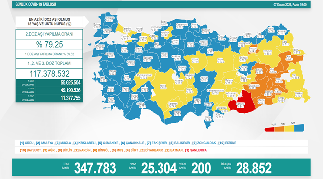Sağlık Bakanlığı'nın sitesindeki Koronavirüs Bilgilendirme Sayfası'nda 7 Kasım koronavirüs tablosu yayınlandı.