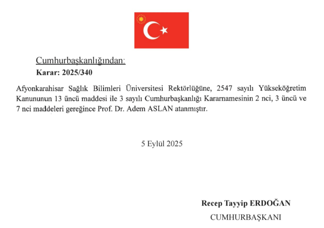 Cumhurbaşkanı Recep Tayyip Erdoğan’ın imzasıyla yayımlanan 2025/340 sayılı karar ile Afyonkarahisar Sağlık Bilimleri Üniversitesi (AFSÜ) Rektörlüğüne yeni bir atama gerçekleştirildi.