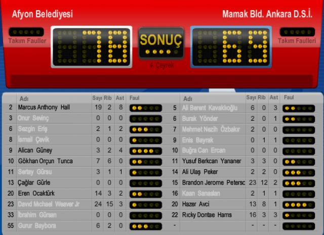 Afyon Belediye: Marcus Hall 19 sayı, 2 ribaund, 8 asist, David Weaver 24 sayı, 15 ribaund, 3 asist