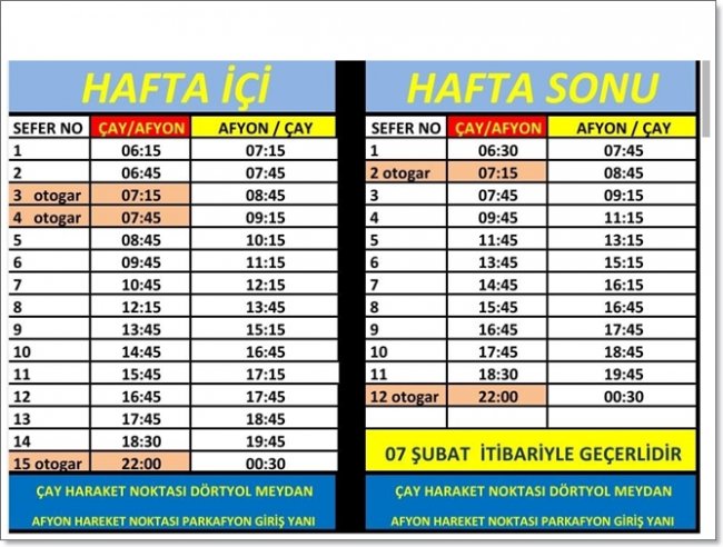 Afyon'dan Çay ilçesine hafta içi ilk otobüs seferi sabah saat 07:15'de başlıyor. Akşam Saat 00:30'a kadar seferler devam ediyor.