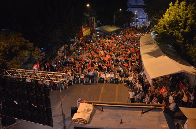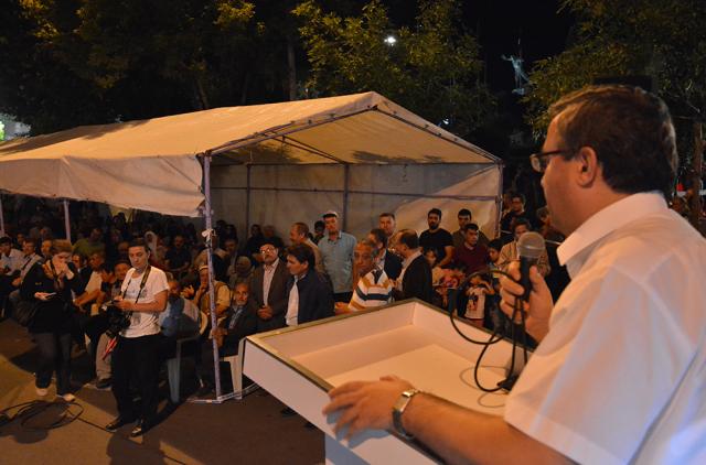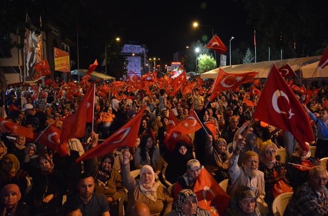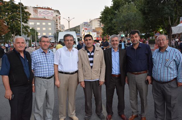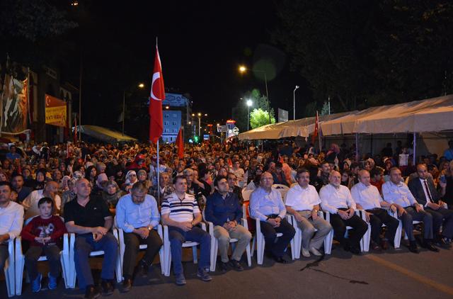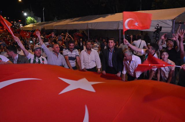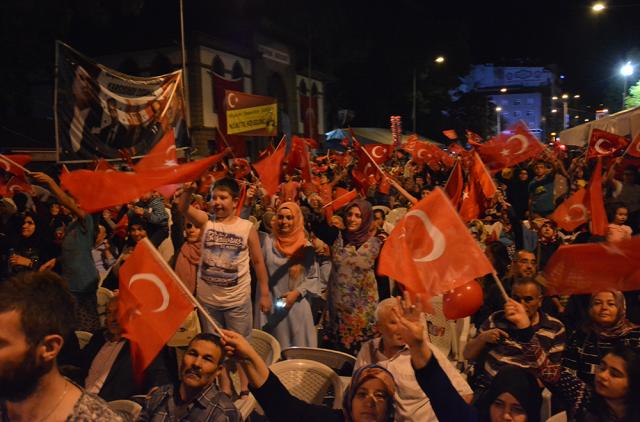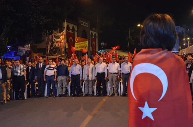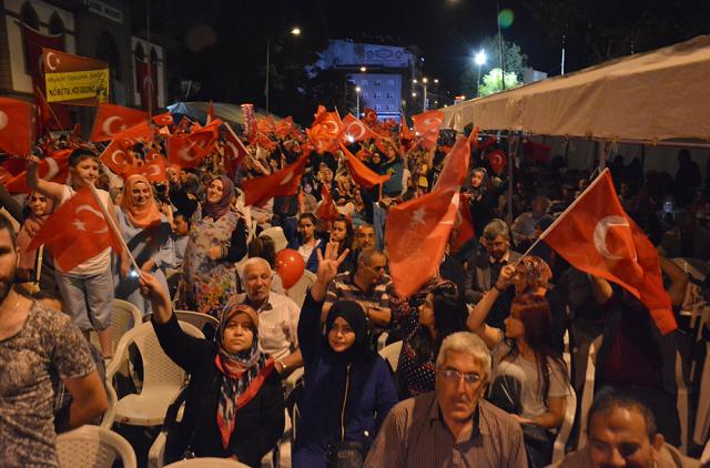 MEYDANLARDA DEMOKRASİ NÖBETİ DEVAM EDİYOR FETÖ/PYD darbe kalkışmasına karşı Afyonkarahisar halkı demokrasi nöbetinin 11.gününde aynı direnç ve heyecanla meydanları doldurdu. Meydanları dolduran Afyonkarahisar’lılar, Cumhurbaşkanı Recep Tayyip Erdoğan’ın ikinci bir talimatına kadar meydanları terk etmeyeceklerini sıkça haykırdı. Afyonkarahisar’da demokrasi nöbetinin 11. gün programını Eğitim-Bir-Sen Şubesi üstlendi. Kur’an-ı Kerim tilaveti, sela ve yatsı ezanının okunmasıyla topluca namaz kılındı. On birinci gün nöbetinde sıkça, “Cumhurbaşkanımız, Başkomutanımız Recep Tayyip Erdoğan’ın ikinci bir talimatına kadar meydanları boş bırakmamaya and içtik” vurgusu yapıldı. Meydanları dolduran 7’den 77’ye binlerce Afyonkarahisar’lı darbe girişiminde bulunan FETO terör örgütüne lanet yağdırdı.