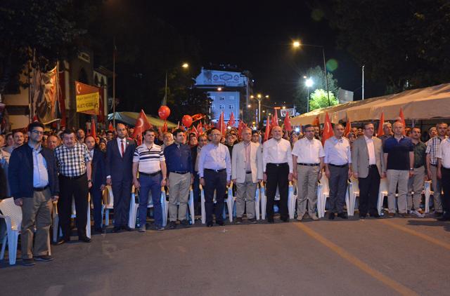 Nöbet programının açılış konuşmasını yapan AK Parti Afyonkarahisar İl Başkanı İbrahim Yurdunuseven, Bakanlar Kurulu Toplantısı nedeniyle Afyonkarahisar programını erteleyen Orman ve Su İşleri Bakanı Veysel Eroğlu’nun selamını iletti. Yurdunuseven; “Darbe kalkışması gecesinde Allah bizimle idi. Bize Allah yardım etti. Milli irademize sahip çıkabilmek için 250 şehit verdik. Şehitlerimizin sayesinde meydanlarda toplanarak demokrasi nöbetlerini tutuyor, milli irademize sahip çıktığımız haykırabiliyoruz. Allah’tan hepsine gani gani rahmet diliyorum. Tüm şehitlerimizin aziz ruhlarına ithafen birer Fatiha okunmasını istirham ediyorum” dedi. ALLAH HEPİMİZİN YARDIMCISI OLSUNEğitim-Bir-Sen Afyonkarahisar Şube Başkanı Abdullah Çelik yaptığı konuşmada, FETÖ/PYD darbe kalkışması ile ilgili olan herkesin cezasını çekeceğini belirtti. FETÖ lideri Fettullah Gülen’in korku içinde bulunduğunu belirten Çelik, “Artık o insan korkuyor, titriyor, dış güçlere adeta yalvarıyor. Daha da yalvaracak. 15 Temmuz gecesini hiçbir zaman unutmayacağız. Eğer bizler milli irademize, demokrasimize sahip çıkmak için bu meydanlarda olmazsak bu meydanlarda başka güçler olur. Bizler bu meydanlarda olmazsak, tanklar, toplar, tüfekler olur. Demokrasimizi ve milli irademizi koruma mücadelemizde Allah hepimizin yar ve yardımcısı olsun” diye konuştu. Videoların izlenmesi ve şiirlerin okunmasıyla demokrasi nöbeti sabah namazının kılınmasına kadar devam etti. AFAD İl Müdürlüğü de nöbet tutan vatandaşlara çorba ikram etti.