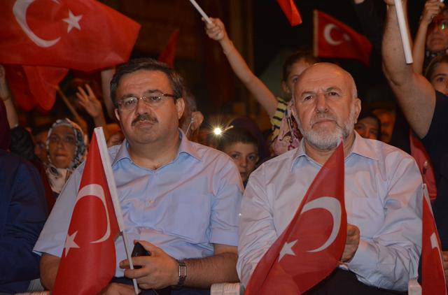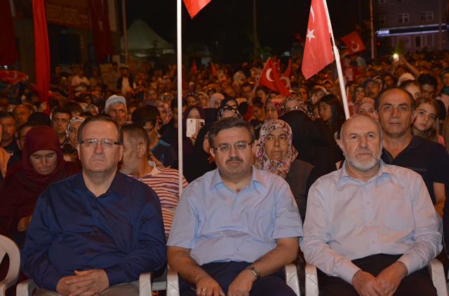 HAFIZ ERARABACI NÖBETE KATILANLARIN GÖNÜLLERİNİ MEST ETTİ FETO/PDY terör örgütünün darbe kalkışması sonrası 21 gündür meydanları terk etmeyen binlerce Afyonkarahisar’lı Anıtpark önünde demokrasi nöbetine devam etti. FETO/PDY terör örgütünün 15 Temmuz günü darbe girişiminde bulunmasının ardından Cumhurbaşkanı Recep Tayyip Erdoğan’ın çağrısı ile meydanlara inen binlerce Afyonkarahisar’lı demokrasisine ve hükümetine sahip çıkmaya devam etti. Demokrasi nöbetinin 21’inci gününde gencinden yaşlısına binlerce Afyonkarahisar’lı meydanları doldururken, darbe girişiminde bulunanlara lanet yağdırdı. Demokrasi nöbeti Kuranı- Kerim tilaveti ve dualarla başladı. Cumhuriyet Meydanı’nda devam eden demokrasi nöbetlerinin konuğu ezan okuma Türkiye birincisi Hafız Mehmet Erarabacı ve ilahi gurubu oldu. BİNLERCE VATANDAŞ KATILDICumhuriyet Meydanı’nda toplanan vatandaşlar, darbe girişimine karşı yine tek ses oldu. Ellerinde Türkiye bayraklarıyla sokaklara çıkan vatandaşlar tekbir ve dualarla meydanlara akın etti. Hafız Erarabacı seslendirdiği ilahiler, kasideler ve kahramanlık türküleriyle gönüllerde taht kurdu. Ezan okuma Türkiye birincisi Hafız Mehmet Erarabacı, programın sonunda okuduğu ezanla gönülleri mest etti.Vali Aziz Yıldırım, Belediye Başkanı Burhanettin Çoban, İl Genel Meclisi Başkanı Salih Sel, AK Parti İl Başkanı İbrahim Yurdunuseven, sivil toplum örgütlerinin temsilcileri, işadamları ve çok sayıda vatandaşın katıldığı gece, sabah namazına kadar devam etti.