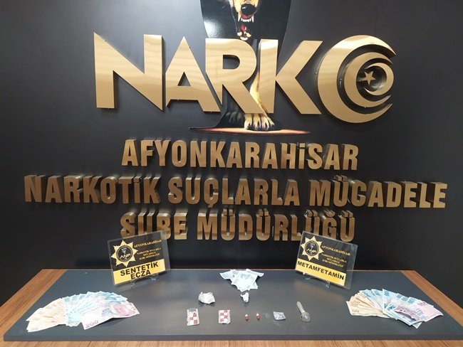 9 adet sentetik ecza maddesi, 2 fişek halinde 1.16 gram satışa hazır metamfetamin, Uyuşturucu madde ticaretinden elde edildiği değerlendirilen 3240 TL para ele geçirildi.
