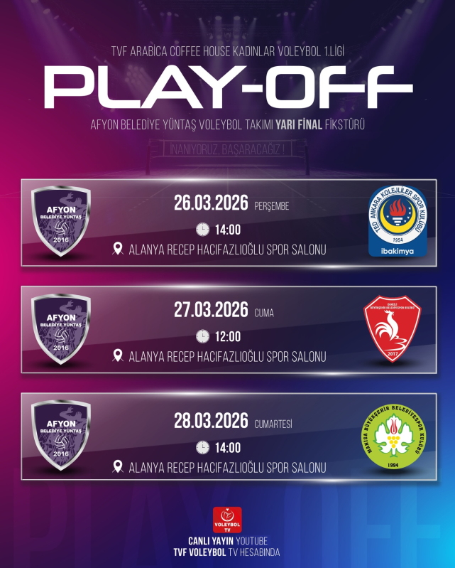 Sultanlar Alanya’da Parkeye İniyor Şehrimizin gururu Afyon Belediye Yüntaş Kadın Voleybol Takımı, TVF Arabica Coffee House Kadınlar Voleybol 1. Ligi Play-Off heyecanına ortak oluyor. Yarı final etabında mücadele edecek temsilcimiz, tüm hazırlıklarını tamamlayarak Alanya’ya odaklandı. Recep Hacıfazlıoğlu Spor Salonu’nun ev sahipliği yapacağı seride, kızlarımızın tek hedefi bir üst tura adını yazdırmak.