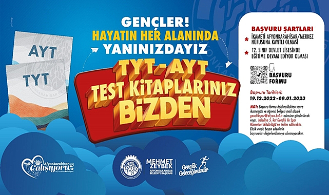 Öğrencilerin ihtiyacı kaynak kitaplar, Afyonkarahisar Belediyesince ücretsiz bir şekilde hediye edilecek. Başvuru formu doldurulduktan sonra müracaatlar Belediye Gençlik ve Spor Hizmetleri Müdürlüğü ya da genclikspor@afyon.bel.tr üzerinden yapılabilecek. TYT- AYT TEST KİTABI DAĞITIMI BAŞVURU DETAYLARIKATILIM ŞARTI: Şehrimizde eğitim gören, üniversite sınavına girecek olan, resmi ikametgâh adresi Afyonkarahisar merkez olan, devlet liselerinde eğitim gören, açık öğretim ve 12. Sınıf öğrencilerine TYT-AYT Test Kitabı seti dağıtılacak.BAŞVURU İÇİN;1- Başvuru Formu doldurulacak.2- Başvuru formu doldurulduktan sonra e devletten alınan ikametgah belgesi ve öğrenci belgesi, tarafımıza genclikspor@afyon.bel.tr elektronik posta adresinden mail olarak ya da elden ulaştırılacaktır.3- Son başvuru tarihi: 09. 01. 2023Not: Eksik ya da yanlış belge teslim adayların başvuruları değerlendirmeye alınmayacaktır. Dağıtım Şubat ayı içinde gerçekleştirilecektir.