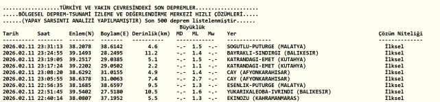 Afyonkarahisar’ın Çay ilçesinde 11 Şubat 2026 Salı günü gece saatlerinde küçük çaplı depremler kaydedildi. Boğaziçi Üniversitesi Kandilli Rasathanesi ve Deprem Araştırma Enstitüsü verilerine göre, merkez üssü Çay olan sarsıntılar saat 23.05 ve 23.08’de meydana geldi. İlk belirlemelere göre depremler düşük büyüklükte gerçekleşti ve herhangi bir can ya da mal kaybı yaşanmadı.
