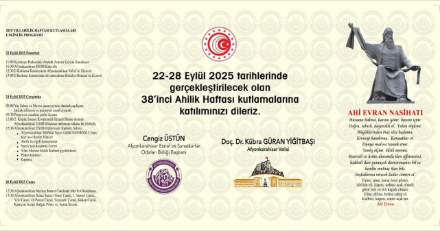 Afyonkarahisar’da geleneksel Ahilik Haftası bu yıl 38’inci kez kutlanıyor. 22-28 Eylül 2025 tarihleri arasında düzenlenecek olan etkinlikler, şehrin dört bir yanında esnafı, sanatkarı ve vatandaşları bir araya getirecek.