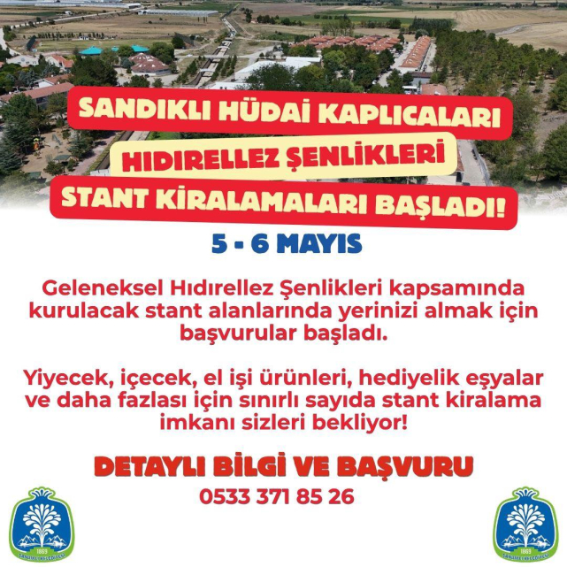 Afyonkarahisar’ın Sandıklı ilçesinde her yıl düzenlenen Geleneksel Hıdırellez Şenlikleri öncesinde stant kiralama süreci başladı. Sandıklı Belediyesi tarafından yapılan bilgilendirmeye göre, etkinlikler bu yıl 5-6 Mayıs tarihlerinde Hüdai Kaplıcaları bölgesinde gerçekleştirilecek.