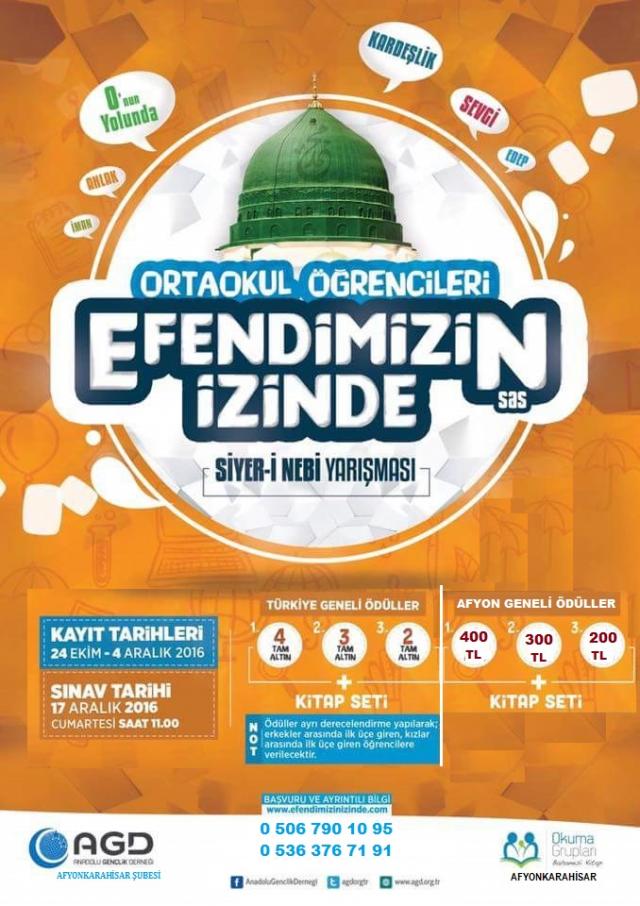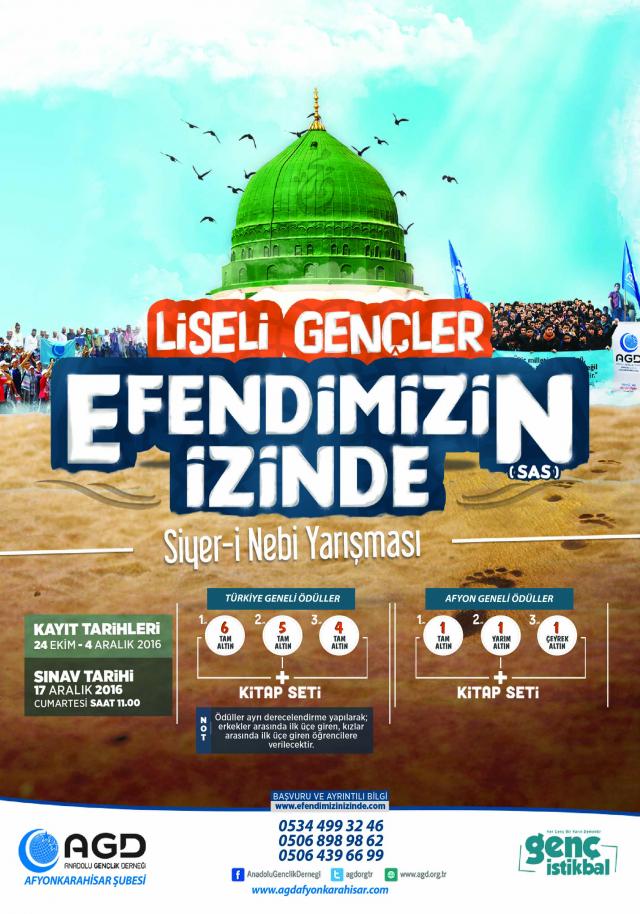 Mesut DÜNDAR; “Her genç yetiştirilmeyi bekleyen bir çiçek gibidir. Bizim için hiçbir gencimiz feda edilmeyecek kadar değerlidir. Fidanlar erken yaşlarda nasıl eğilirler ve şekil alırlarsa gençlerimiz de ortaokul ve lise çağlarında şekillenirler ve aldıkları şekilleri yaşamlarına aksettirirler. Ülkemiz gençliğinin içerisinde bulunduğu durum ortadadır. Gençlerimize bulundukları konumu, kendilerine kalan mirası ve gidecekleri rotayı vermek için yarışmamız çok önemlidir. Anadolu Gençlik Derneğimizin bu Türkiye geneli Siyer-i Nebi Yarışması hedefi doğrultusunda, Peygamberimizin hayatını gençlerimizin örnek alması son derece mühimdir. Yapacağımız yarışma bir nebze de olsa hayatın bitmeyen hengamesinde öğrencilerimize ulaşmakta önemli bir adımdır” dedi.Yarışma Kayıt Tarihi : 24 Ekim – 4 Aralık 2016Sınav Tarihi : 17 Aralık 2016 / Cumartesi Saat : 11.00Kayıt ve İrtibat Tel : 0 506 898 98 62 – 0 534 499 32 46Adres : Anadolu Gençlik Derneği Afyonkarahisar İl ve İlçe TemsilcilikleriÖDÜLLERTÜRKİYE GENELİ (LİSELER)