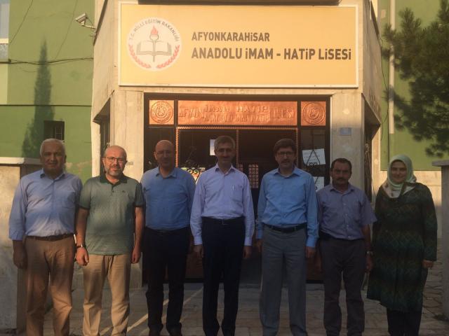 Din Öğretimi Genel Müdürü Nazif Yılmaz, Daire Başkanı İhsan Erkul ve İl Milli Eğitim Müdürü Metin Yalçın, Afyonkarahisar Anadolu İmam Hatip Lisesini ziyaret etti. İmam Hatip Okulları ile ilgili bir çalıştay nedeniyle ilimizde bulunan Genel Müdür Yılmaz, TÜBİTAK Türkiye Birinciliği ve ÖSYM öğrenci yerleştirmedeki başarısı nedeniyle Afyonkarahisar Anadolu İmam Hatip Lisesine yaptığı ziyarette tüm ekibi kutladı. Genel Müdür Yılmaz, 51 yıllık geçmişiyle köklü ve başarılı bir okul olan Afyonkarahisar Anadolu İmam Hatip Lisesinin güzel insanlar yetiştirdiğini ifade etti. Yılmaz, son yıllardaki başarılarından dolayı Anadolu İmam Hatip Lisesini, özel program uygulayan özellikli okullar kapsamına almayı düşündüklerini söyledi. Okul idaresi ise ziyaretten duydukları memnuniyeti ifade ederek, ziyaretleri için kendilerine teşekkür ettiler.