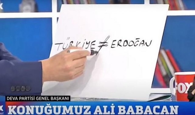 DEVA Partisi Genel Başkanı Ali Babacan, FOX TV’de İsmail Küçükkaya ile Çalar Saat programında gündemdeki sıcak gelişmeleri değerlendirdi. Babacan, Cumhurbaşkanı Erdoğan’ın “Bu kardeşinize saldırmak Türkiye’ye saldırmaktır” sözlerini, kâğıda “Türkiye eşit değildir Erdoğan” yazarak yanıtladı. Erdoğan’ı “‘Türkiye eşittir Erdoğan’ denklemini kurmaya çalışıyor” diyerek eleştiren Babacan, canlı yayında denklemi değiştirdi. Babacan şu ifadeleri kullandı: