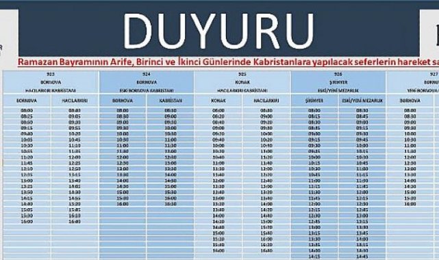 ESHOT otobüs seferleri, bayram süresince pazar günü çalışma programına göre yapılacak. Orman köyü hatları da çalışacak. ESHOT Genel Müdürlüğü, arife günü ile bayramın ilk iki günü mezarlıklara, özel seferler de yapacak. Önceki bayramlarda 12 olan mezarlık hatlarına, üç yeni hat daha eklendi. Programa ilişkin ayrıntılı bilgilere, www.eshot.gov.tr internet adresinden ulaşılabilir.