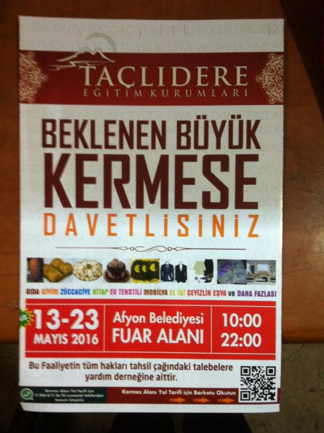 Taçlıdere Eğitim Kurumları’nın günlerdir beklenen büyük kermesi, 13 Mayıs Cuma günü saat: 10:00 ‘da Afyonkarahisar Fuar Alanı’nda açılıyor.Gıdadan giyime, zücaciyeden ev tekstiline kadar birçok ürünün satışa sunulacağı kermes’e Her yıl olduğu gibi bu yılda büyük ilgi bekleniyor. Taçlıdere Eğitim Kurumları’nın her yıl geleneksel olarak düzenlediği kermesten farklı olarak, Afyonkarahisar’da daha önce benzeri görülmemiş büyüklükteki kermesin açılışı, Cuma günü saat:10:00’da Afyonkarahisar Fuar alanında yapılacak.Taçlıdere Eğitim Kurumları’nın eğitim ve sosyal faaliyetleri ile Afyonkarahisar’ın en güzide eğitim kurumlarından olan Taşlıdere Eğitim kurumları ve Karşıyaka,Selçuklu, hisarüstü, Selimiye,sahip ata,Karşıyaka,yarenler,erenler yurtlarının, Ev hanımlarının ortaklaşa yapmış olduğu, bay bayan çeyizlik eşyaların bulunduğu, Ev hanımlarının, yaş ,kuru pasta, ev yapımı el yapımı baklavaları, ev mantısına kadar Afyonun yöresel yiyecek , içecek bütün mevcutların bulunduğu, Afyon’daki esnafların da yardım ettiği, tamamen yardımdan oluşan Büyük Kermes’e yoğun ilgi bekleniyor.‘KERMES AĞA’SI’ YARIŞMASI YAPILACAKKermesin Açılışını Vali ve belediye başkanları ve siyasi parti milletvekilleri katılacaktılacağını belirten yetkililer, ‘ Afyonun bütün iş adamları, Kermes Taşlıdere her hangi bir kumuna da ait olsa halkın her kesimden sevgisini kazanmıştır. Her yılda Büyük Kermese düzenli bir şekilde davet vardır. Kermeste, her yıl olduğu gibi Kermes’in en önemli ana maddelerinden biri Ağalık yarışmasıdır. Afyon’daki bütün iş adamları orada bir Deve çıkar oraya, açık artırma ile deve satışı yapılmaktadır. Bu deve’de oradaki kuran okuyan talebelere verilmektedir. Onların erzakları karşılanmaktadır giderleri karşılanmaktadır’dediler.
