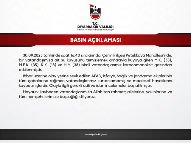 Diyarbakır’ın Çermik ilçesi Petekkaya Mahallesi’nde yaşanan olayda, temizlemek için girdikleri su kuyusunda zehirlenen 4 kişi yaşamını yitirdi. Olay, saat 16.40 sıralarında meydana geldi.