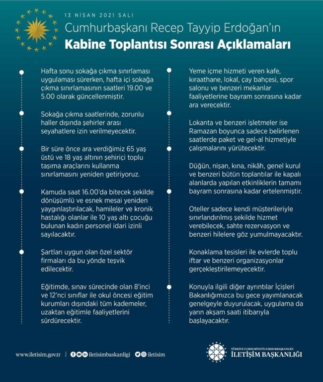 Cumhurbaşkanı Erdoğan, koronavirüs salgınına dair şu kısıtlama kararlarını açıkladı:• Ramazan ayının ilk iki haftasında kısmi kapanma kararları uygulanacak.• Hafta sonu kısıtlamaları sürerken hafta içi sokağa çıkma sınırlamasının saatleri 19.00-05.00 olarak güncellendi.• 65 yaş üstü ve 18 yaş altının şehir içi toplu taşıma araçlarını kullanma sınırlaması yeniden getirildi.• Sokağa çıkma saatlerinde zorunlu haller dışında şehirler arası seyahatlere izin verilmeyecek.• 8. ve 12. sınıflar ile okul öncesi eğitim kurumları dışındaki tüm kademeler uzaktan eğitimle faaliyetlerini sürdürecek.• Kamuda saat 16.00’da bitecek şekilde dönüşümlü ve esnek mesai yeniden yaygınlaştırılacak. Kamuda hamileler ve kronik hastalığı olanlar ile 10 yaş altı çocuğu bulunan kadın personel idari izinli sayılacak.• Lokanta ve benzeri işletmeler ramazan boyunca sadece belirlenen saatlerde paket ve gel-al hizmetiyle çalışmalarını yürütecek. Yeme içme hizmeti veren kafe, kıraathane, lokal, çay bahçesi, spor salonu, benzeri mekanlar faaliyetlerine bayram sonuna kadar ara verecek.• Oteller, sadece kendi müşterileriyle sınırlandırılmış şekilde hizmet verebilecek, sahte rezervasyon ve benzeri hilelere göz yumulmayacak.• Düğün, nişan, kına, nikah, genel kurul ve toplantılar ile kapalı alanlarda yapılan etkinliklerin tamamı Ramazan Bayramı sonrasına kadar ertelendi.