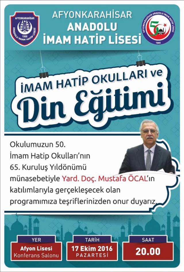 Afyonkarahisar Anadolu İmam Hatip Lisesi'nin 50. ve İmam Hatip Okullarının 65. Kuruluş yıldönümü münasebetiyle 17 Ekim 2016 tarihinde Afyon Lisesi Konferans salonunda Konferans düzenliyor. Konferans Yard.Doç. Mustafa Öcal'ın katılımları ile gerçekleşecek. 17 Ekim 2016 Pazartesi günü Afyon Lisesi Konferans salonunda Saat : 20:00 'de gerçekleşecek olan proğrama teşriflerinizden onur duyarız.