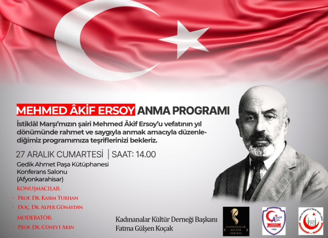 Afyonkarahisar TOBB Kız Anadolu İmam Hatip Lisesi ile Afyonkarahisar Merkez Anadolu İmam Hatip Lisesi iş birliğinde düzenlenecek etkinlikte, Mehmet Âkif Ersoy’un hayatı, fikir dünyası, ahlâk anlayışı ve milletimize bıraktığı manevi miras ele alınacak. Programda millî ve manevî değerler çerçevesinde değerlendirmeler yapılması planlanıyor.