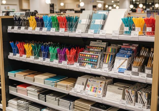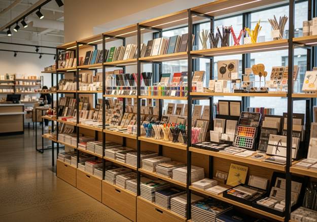 Kırtasiye mağazaları, kalemden deftere, sanatsal malzemelerden ofis gereçlerine kadar geniş bir ürün yelpazesine sahiptir. Her ürün grubunun kendine özgü sergileme ihtiyaçları vardır.
