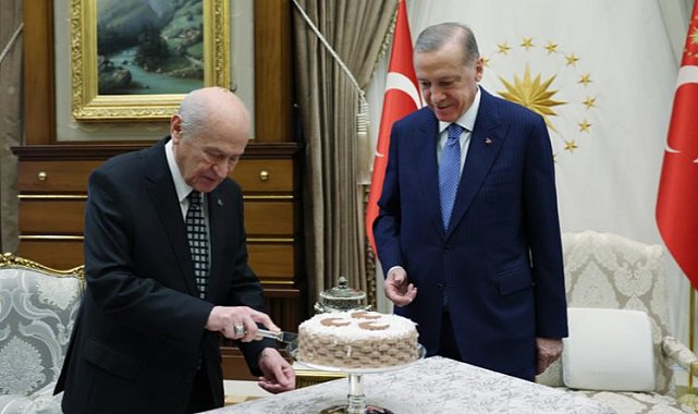 Cumhurbaşkanlığı Külliyesi'ndeki buluşma öncesinde Cumhurbaşkanı Erdoğan, 1 Ocak'ta 75'ine girecek olan ittifak ortağı MHP Genel Başkanı Devlet Bahçeli için erken doğum günü kutlaması yaptı.ANKARA (İGFA) - Cumhurbaşkanı Recep Tayyip Erdoğan, MHP Genel Başkanı Devlet Bahçeli'yi Cumhurbaşkanlığı Külliyesinde kabul etti.İkili, görüşmeye başlamadan önce doğum günü kutlaması yaptı.Cumhurbaşkanı Erdoğan, 1 Ocak 2023 tarihinde 75 yaşına girecek olan MHP lideri Devlet Bahçeli'ye üç hilalli pasta kestirdi.MHP Genel Başkanı Devlet Bahçeli, üç hilalli pastayı Cumhurbaşanı Erdoğan'a ikram etti.Bahçeli, ayrıca Erdoğan'a Cumhuriyet'in 100'üncü yılına ithafen 1 adet kırmızı ve 99 adet beyaz gül takdiminde bulundu.İkili arasındaki görüşme yaklaşık 50 dakika sürerken, görüşmenin ayrıntılarına ilişkin herhangi bir açıklama yapılmadı.