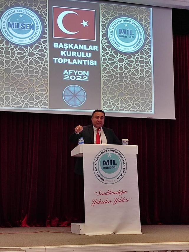 Manevi İlkeli ve Liyakatli Sendikalar Konfederasyonu bağlı Mil Büro Sen Büro Memurları Sendikasının 1’nci İl ve İlçe Başkanları toplantısı Afyonkarahisar’da yapıldı. Toplantıya Mil Sen Konfederasyonu Genel Başkanı Mücahit Çelik, Mil Diyanet Sen Genel Başkanı Celalettin Gül ve Yardımcısı Ahmet Tahiroğlu, Sağlık Mil Sen Genel Başkanı Mustafa Taç ile il ve ilçe başkanları katıldı.