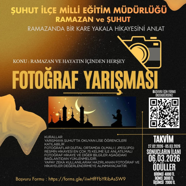 Afyonkarahisar’ın Şuhut ilçesinde Ramazan ayı, bu yıl gençlerin objektifinden süzülen karelerle ölümsüzleşiyor. Şuhut İlçe Milli Eğitim Müdürlüğü, ilçedeki lise öğrencilerini yeteneklerini sergilemeye davet eden "Ramazan ve Hayatın İçinden Her Şey" konulu özel bir yarışma açtı.