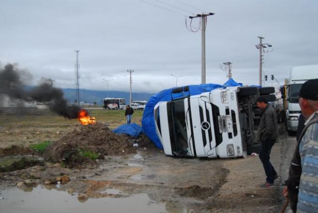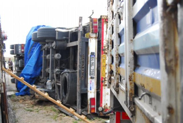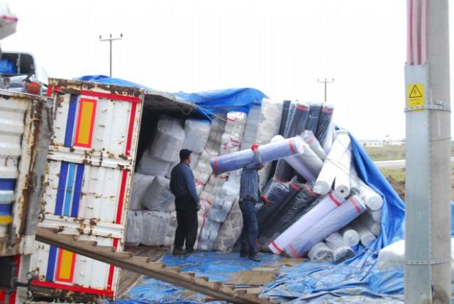 Edinilen bilgiye göre, Hasan Güzel idaresindeki 64 NL 759 plakalı tekstil malzemesi yüklü TIR, Afyon Kocatepe Ünüversitesi yolu Organize kavşağında sürücüsünün direksiyon hakimiyetini kaybetmesi sonucu devrildi.