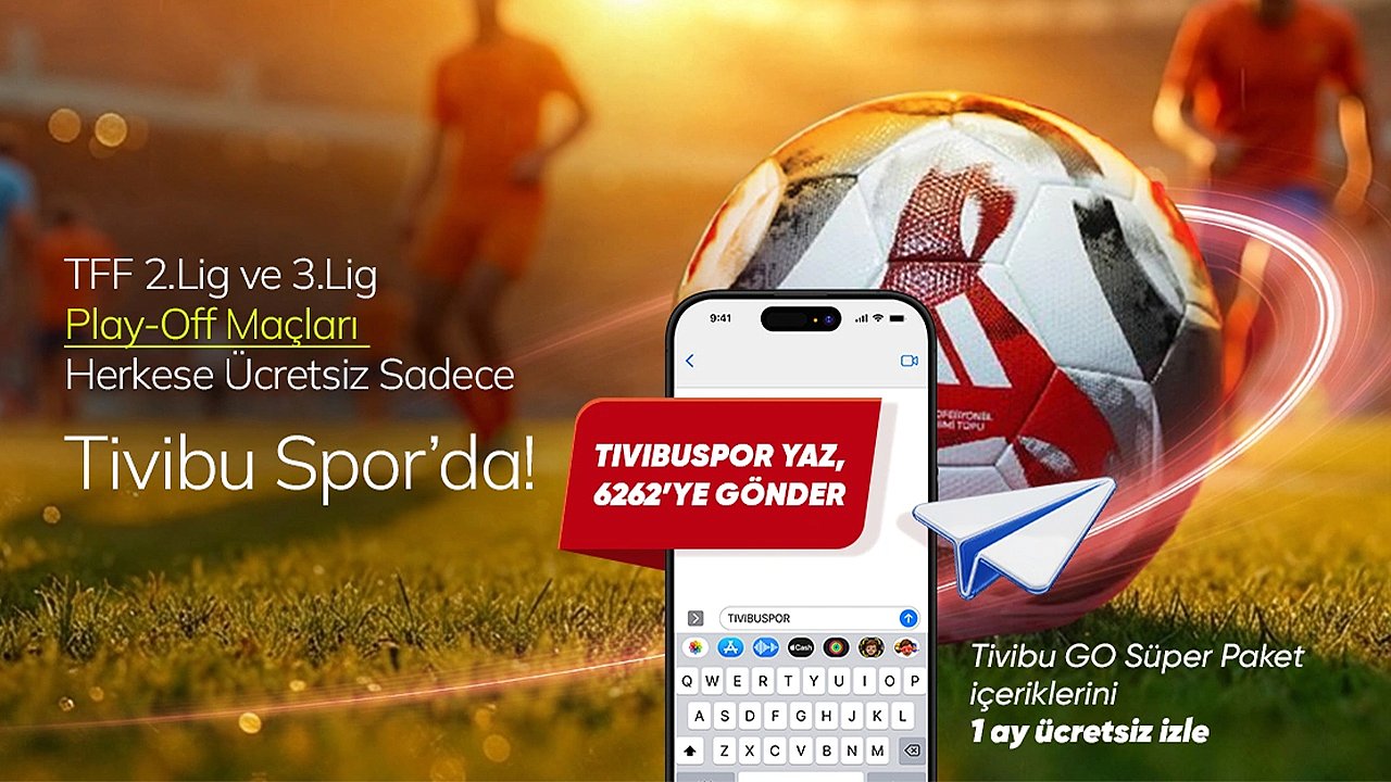 Paylaşılan tanıtım görselinde “TFF 2. Lig ve 3. Lig Play-Off Maçları Herkese Ücretsiz Sadece Tivibu Spor’da” ifadesi yer alıyor. Görselde ayrıca “Tivibu GO Süper Paket içeriklerini 1 ay ücretsiz izle” bilgisi de dikkat çekiyor.