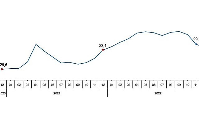 anayi, inşaat, ticaret ve hizmet sektörleri toplamında ciro endeksi (2015=100), 2022 yılı Aralık ayında yıllık %89,7 arttı.